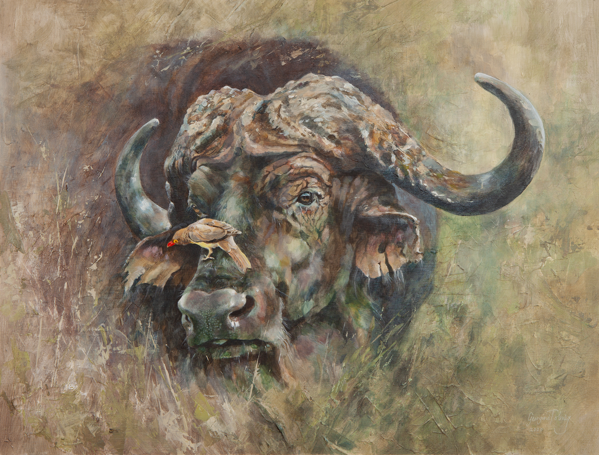 The Cape Buffalo with the Ox Pecker is titled “Have You Found it Yet?” Acrylic on canvas paper and framed. Image size is: 19″ x 25.5″